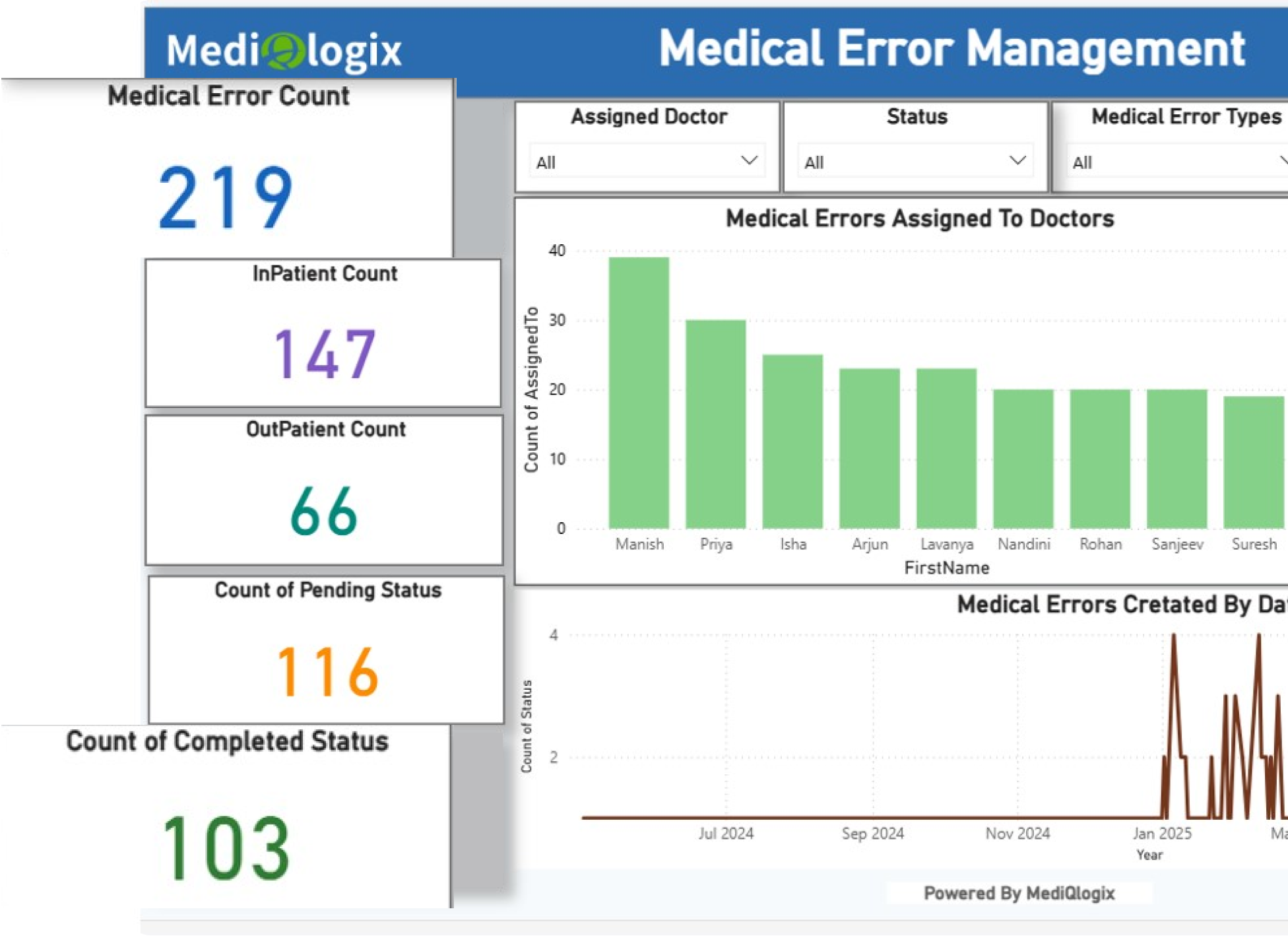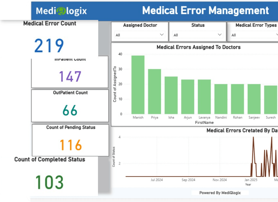 MediQM empowers healthcare organizations to log, manage, and resolve incidents for patients, staff, visitors, and hospital infrastructure in real time. Key capabilities include: